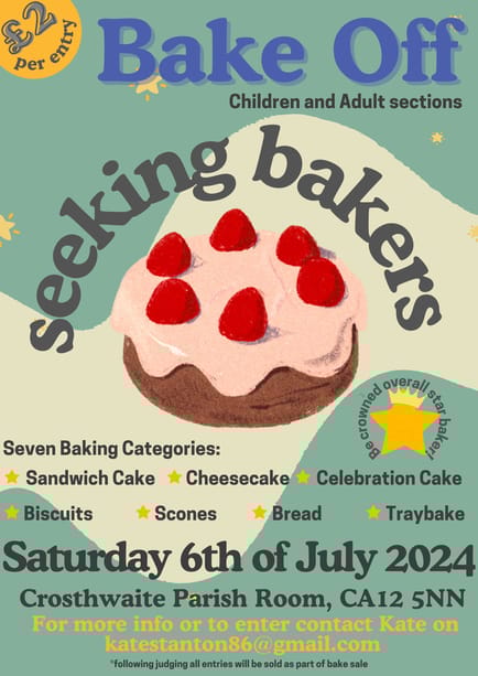 <ul> <li>There are adult and children sections to the Bake Off competition.</li><li>Children's Section is split into under 10 and over 10. You bake whatever you like.</li><li>Entry deadline is Wednesday 3rd July.</li><li>You can enter as many bakes as you wish.</li><li>There will be an experienced panel of judges to pick the winners.</li><li>Following judging, all entries will be sold in aid of the Keswick Rugby Club "Big Build".</li><li>The adult portion of the competition consists of seven baking categories: sandwich cake, scones (total of six, can be savoury or sweet), cheesecake, biscuits (total of twelve), traybake (cut into twelve), celebration cake and bread.</li><li>Event day schedule: 10.00-10.30 contestants to drop off their bakes. 10.30-11.30 judging will take place. 11.30 bakers return for the prize giving. 12.00 bake sale begins.</li></ul>
